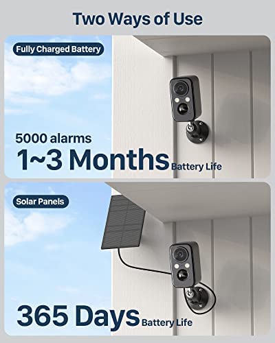 ☀[Solar Camera with 5000mAh Built-in Battery] This surveillance camera has a built -in 5000mAh electricity, equipped with solar panels, so that it can maintain continuous electricity for 365 days. When there is a sun during the day, it can be charged for the camera. When there is no sun at night, use battery power to protect your family’s safety. (Please note that solar panels need to be installed in a place where the solar is direct.)